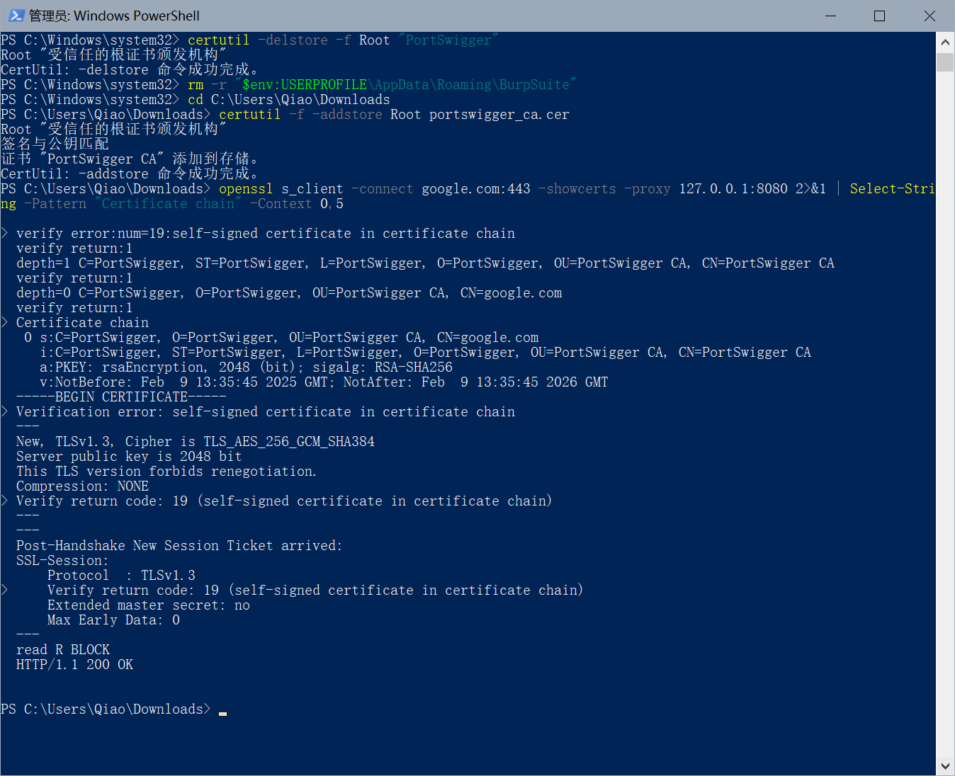 openssl s_client -connect google.com:443 -showcerts -proxy 127.0.0.1:8080 2>&1 | Select-String -Pattern "Certificate chain" -Context 0,5正常应输出类似: