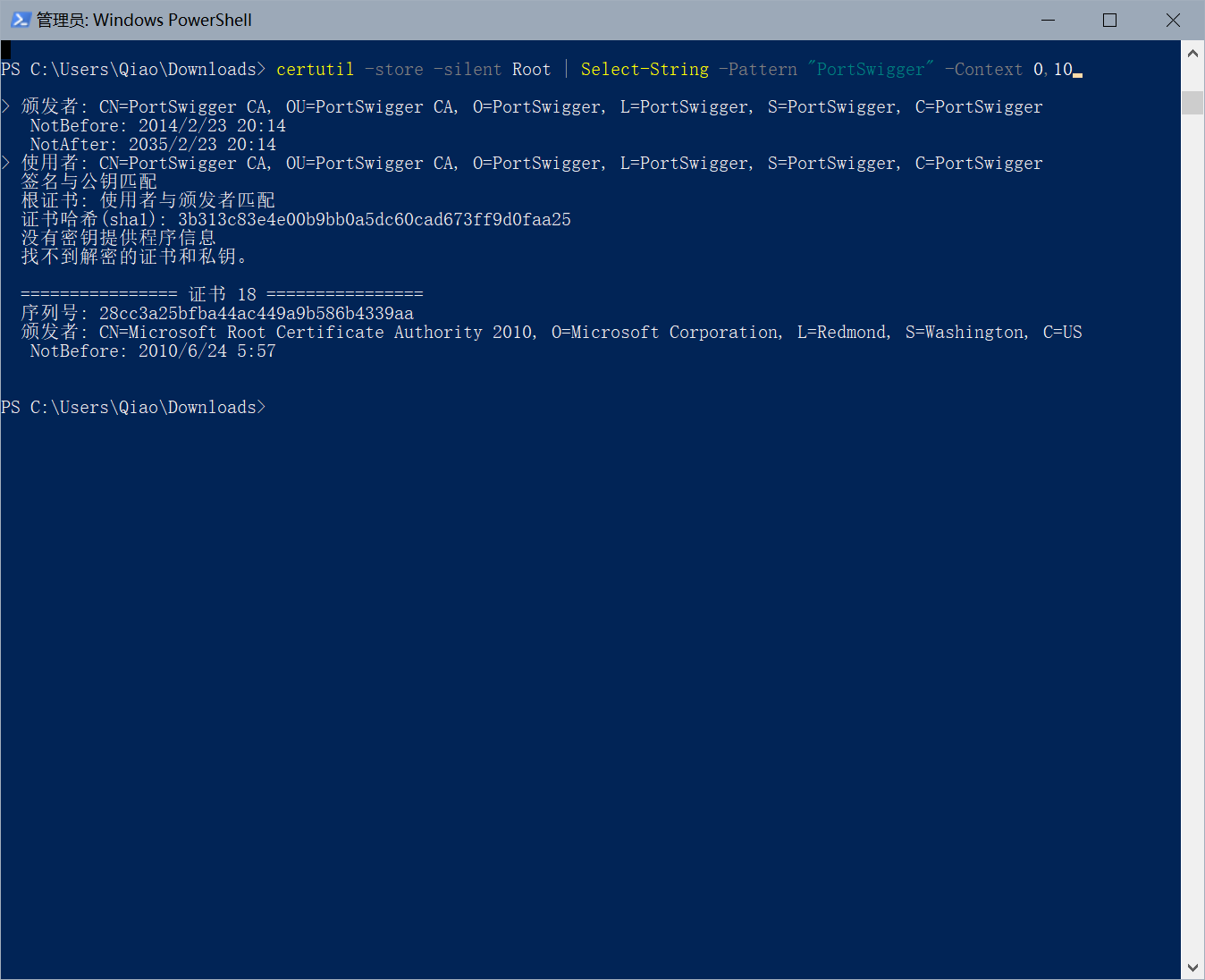 certutil -store -silent Root | Select-String -Pattern "PortSwigger" -Context 0,10