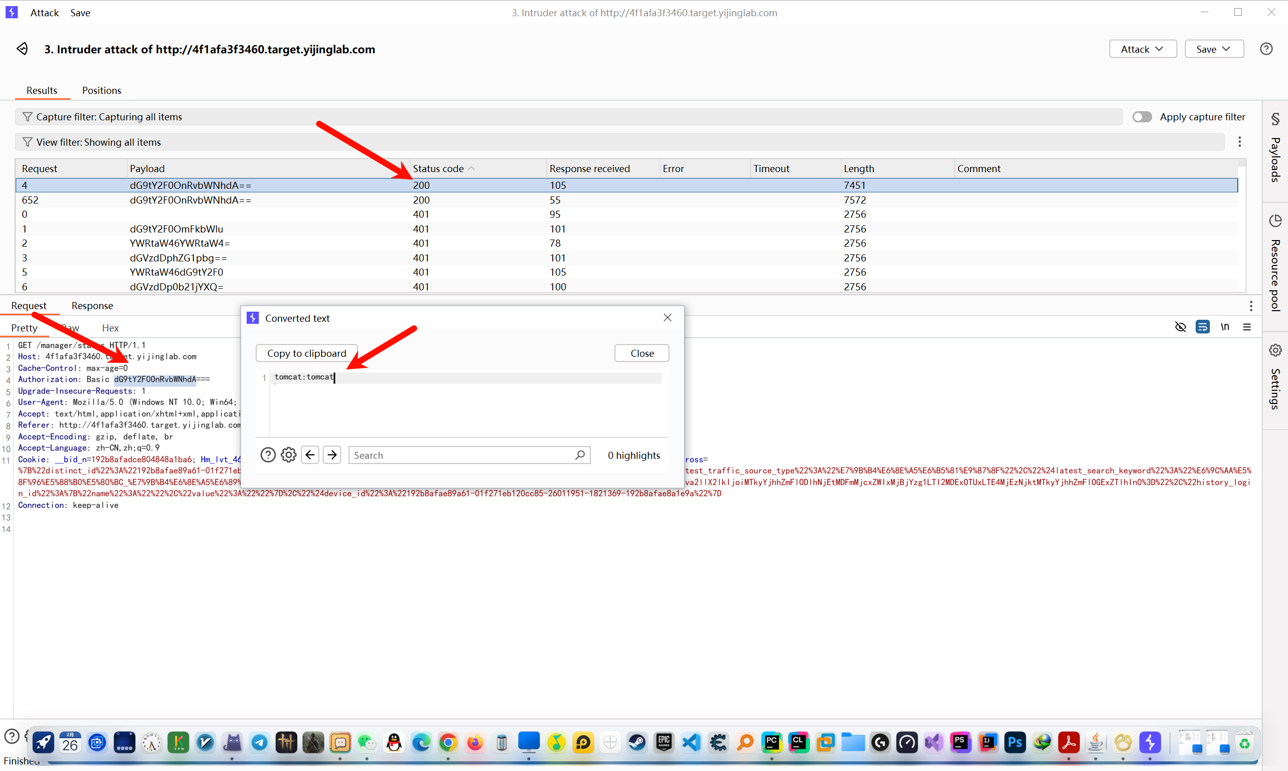 Base64解码成功数据包中的验证数据,得到明文用户名密码。